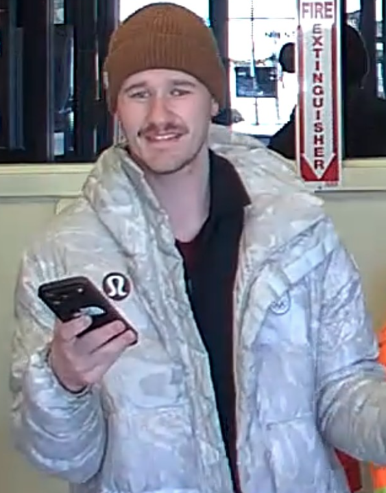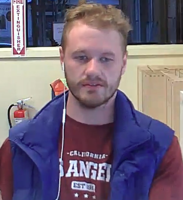 Investigators are seeking to identify a male suspect believed to be in his early 20s to early 30s. The suspect was seen wearing a maroon long-sleeve shirt with white printed text, including the partially visible words “CALIFORNIA” and “ANGELS EST. 19-“. He also wore a blue padded vest over the shirt. The suspect is described as having light brown, curly or wavy hair and a short beard or unshaven.