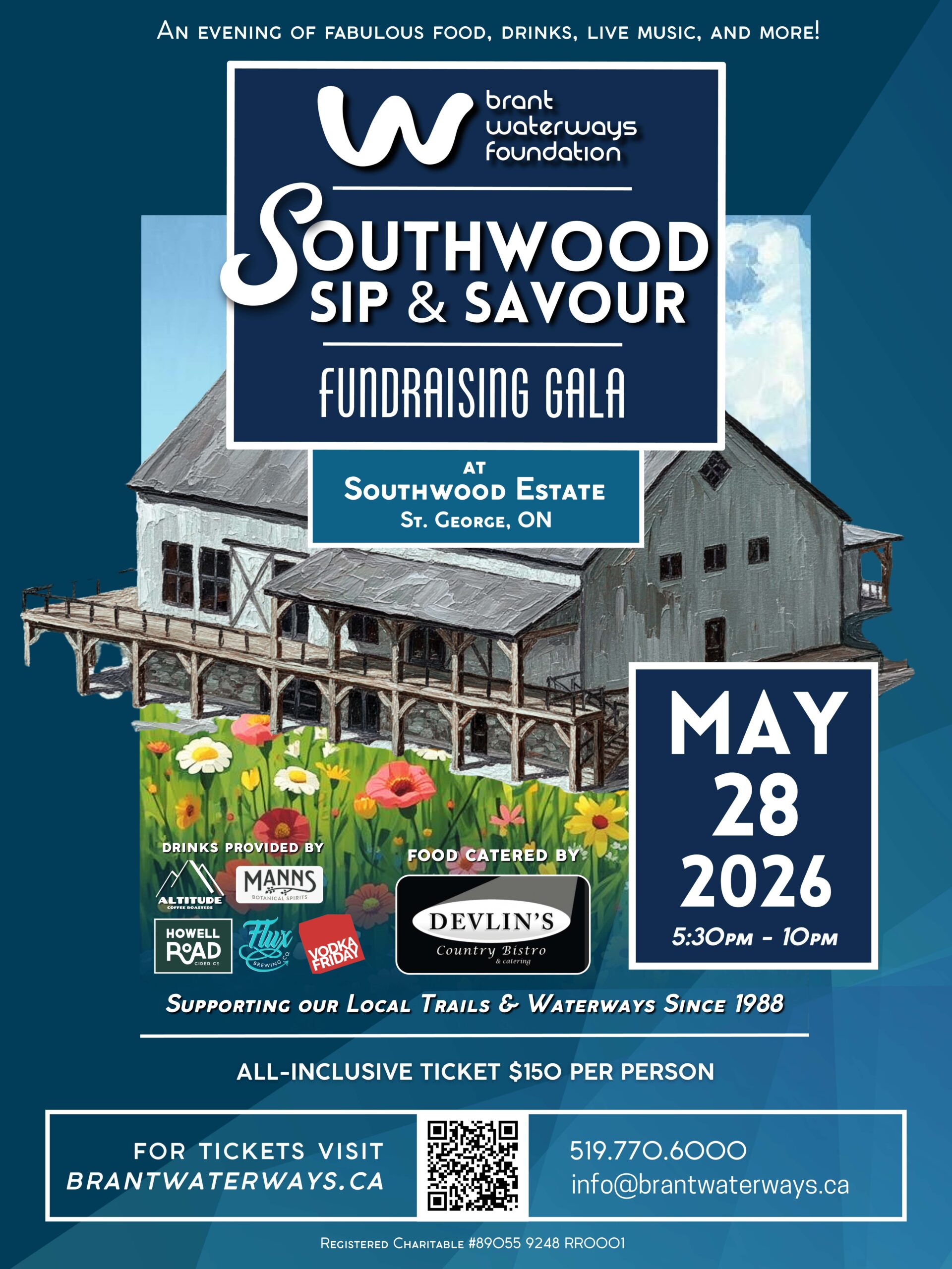 Brant Waterways Foundation annual May fundraising event, this year entitled “SOUTHWOOD SIP & SAVOUR” will take place on Thursday May 28, 5:30 – 10 pm at the new Southwood Estates venue overlooking the rolling farmland near St. George, Ontario. The May fundraiser is a premier community event and a key source of funds for Brant Waterways’ community projects.  The cocktail party style event will raise funds towards tree plantings, environmental advocacy, improved river access points and local trail improvements.