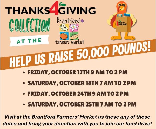 Currently, the food bank has raised a total of 11,569 pounds this month, but with only two more weeks left in October, this is still an urgent need to meet the goal of 50,000. The food bank will be at the Brantford Farmers Market October 17 and 18th and 24 and 25th to accept food and monetary donations.