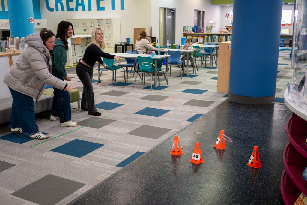 Former classmates of Claire Scheffel participate in a game of Olympic ring toss during a drop-in program at the Brantford Public Library’s main branch on Saturday, February 14, 2026. Pictured in photo, from (l-r): Shea Rannie, Pearl Van Nooten and Lauren Pearce.