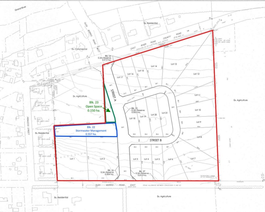 - A Plan of Subdivision to divide the land into 21 single-detached lots on private services, a stormwater management block, and extending Glen Morris Road West from East River Road to Glen Morris Road East.