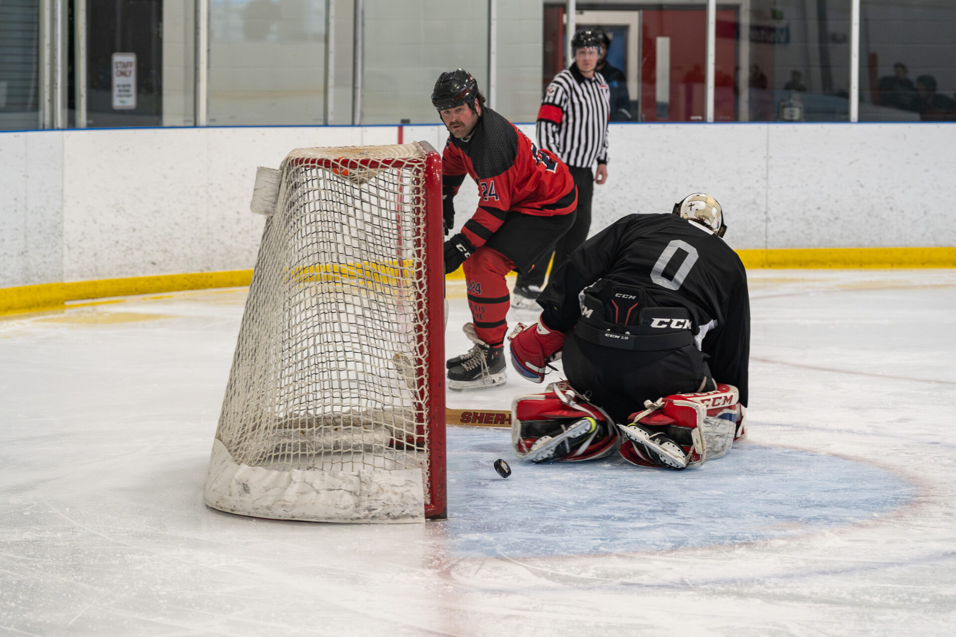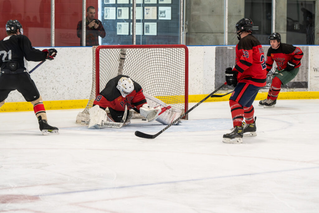 One Airport Station team member lines up his shot during the Paris Station vs. Airport Station hockey fundraising game on Sunday, March 29, 2026.