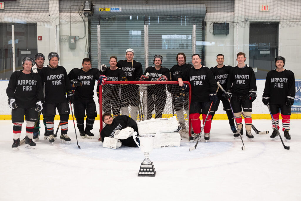 Airport Station team members pose alongside their trophy during the Paris Station vs. Airport Station hockey fundraising game on Sunday, March 29, 2026.