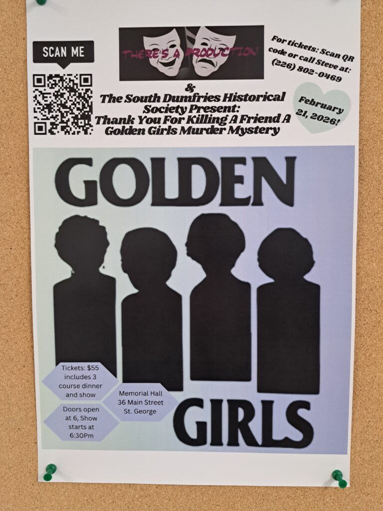There's A Production and the South Dumfries Historical Society present "Thank You for Killing a Friend: A Golden Girls Murder Mystery." Saturday February 21, 2026 at the St. Georg...