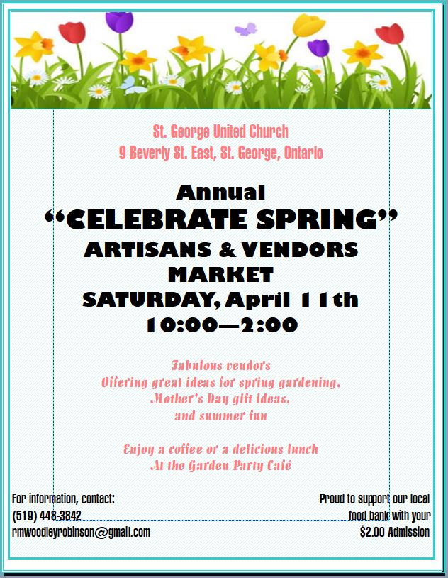 "Celebrate Spring" Artisans & Vendors Market: It's been a long winter, but spring is sure to arrive! St. George United Church, 9 Beverly St. East (Hwy. #5), St. George is ple...