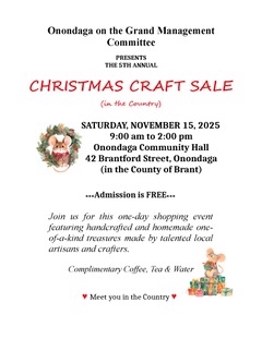 Join us for this one-day annual one-of-a-kind Christmas Craft Sale at the Onondaga Community Hall. Come out and get your Christmas shopping started! Complementary coffee, tea &am...