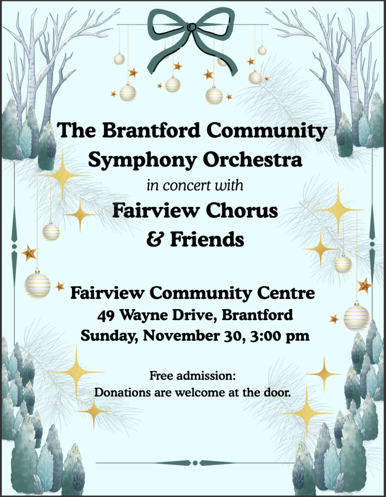 The Brantford Community Symphony Orchestra will be in concert with Fairview Chorus and Friends presenting holiday music, beginning 3pm at the Fairview Community Centre, 49 Wayne Dr...
