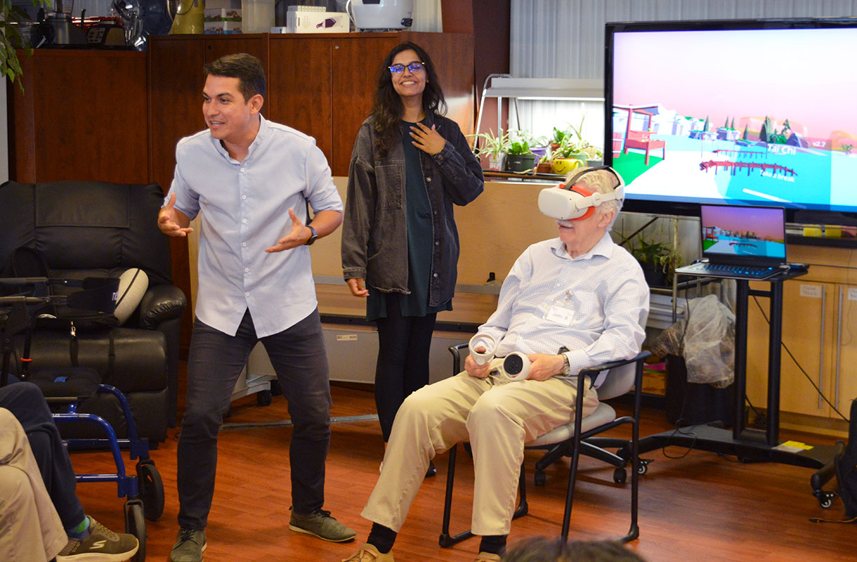 John Muñoz and his students visit the Adult Recreation Therapy Centre to trial a guided VR experience called “Seas the Day.” Photo courtesy Wilfrid Laurier University.