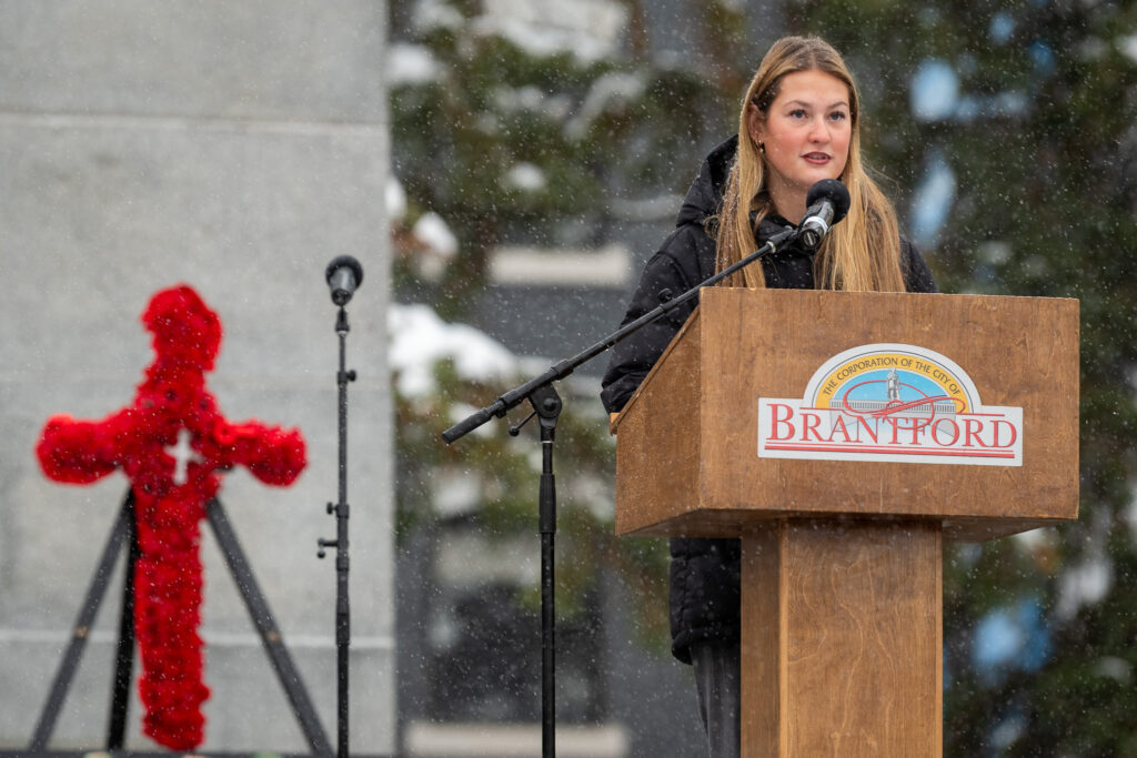 “Through research, I learned that the City of Brantford had more than 6,000 men and women join the armed forces during World War Two, that is more than three times the size of my high school. I couldn’t imagine my life without my friends, my teachers and my family, but these brave men and women left everything they cared for to fight for a war they did not start,” she continued. “The Cenotaph recognizes the brave soldiers from this area and all those who contributed to the war effort. Many people do not know that beyond fighting in the war, the people of this community also helped by supplying materials, such as parts for the aircraft and bombers; in Brantford, many of these were produced in the Massey-Harris factory.”