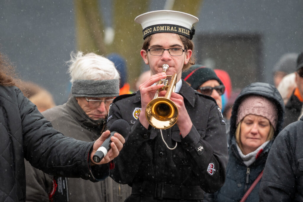 After the minute gun was fired and two minutes of silence was observed, Warrant Officer Jacob Russell performed the Lament on bagpipes, followed by Henderson’s playing of The Rouse.