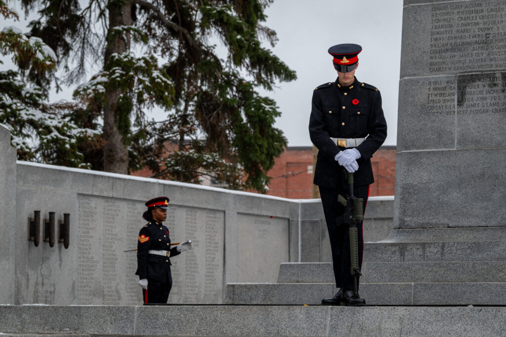 At 10:40 a.m., members of the 56th Field Artillery Regiment, first responders, cadets and local dignitaries began marching behind the colour party and the Brantford Pipes and Drums as they made their way from Harmony Square to the Cenotaph.