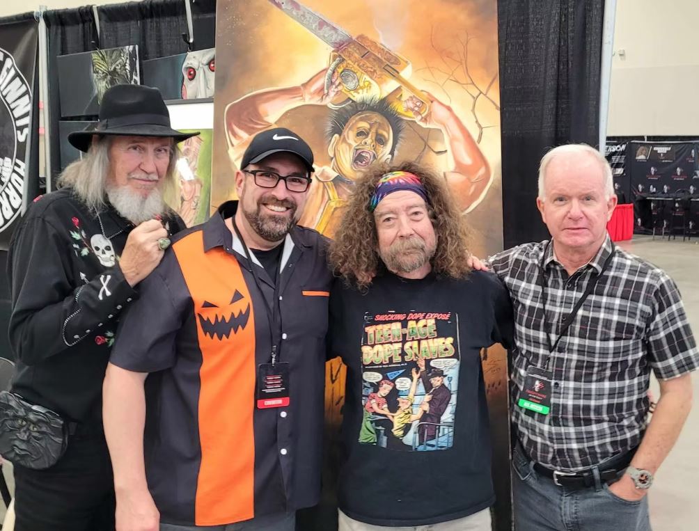 Steve McGinnis is pictured with the cast from the Texas Chainsaw Massacre film and behind them is the poster he made celebrating the classic horror movie. The illustrator has been inspired by music as well as movies including those of the slasher genre. Photo courtesy Steve McGinnis.