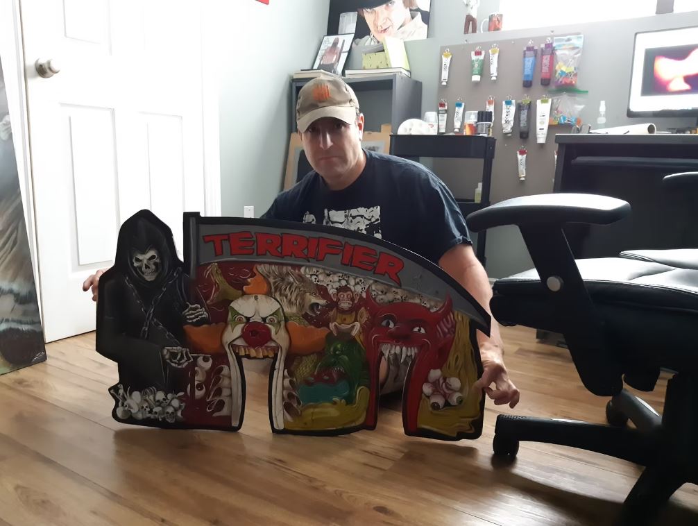 In 2018 Steve illustrated the alternative VHS cover for the Terrifier film as well as illustrating the Terrifier Graphic novels and doing work on Terrifier 2 (including developing the funhouse, and creating art for the cereal boxes and art pieces for signings at conventions.) Photo courtesy Damien Leone/Dark Age Cinema.