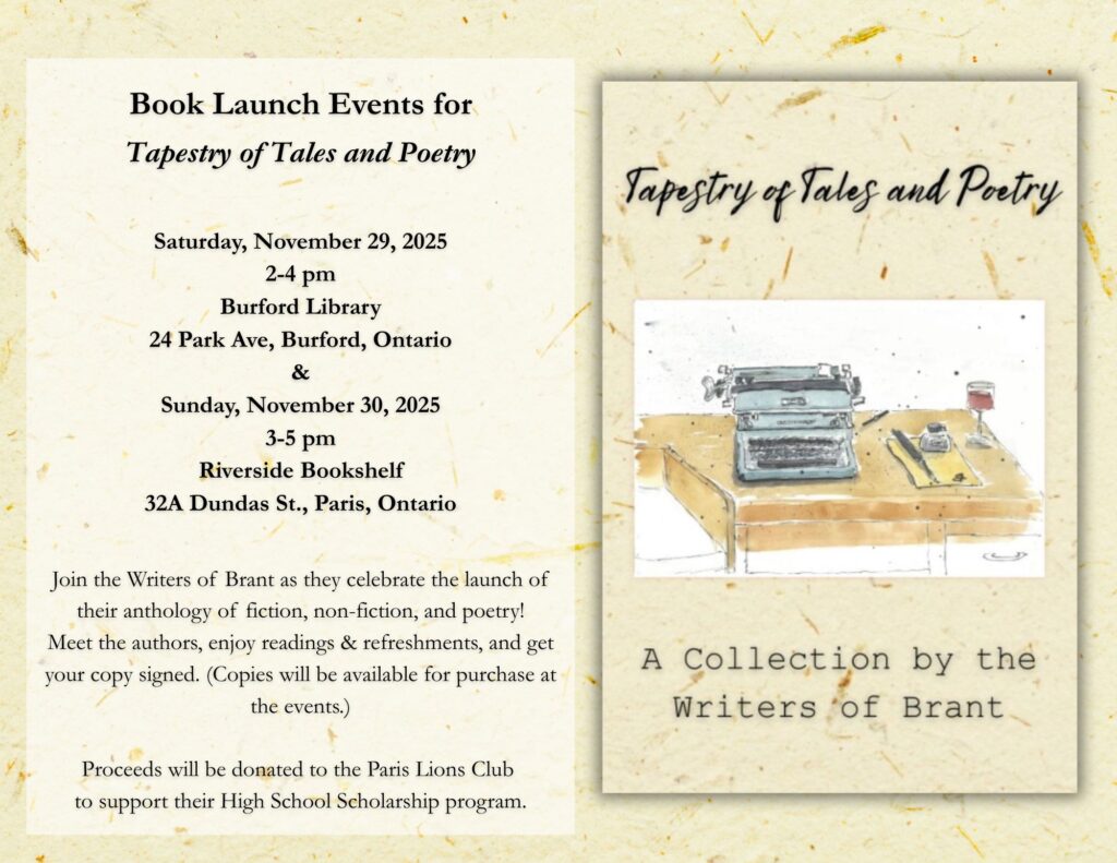 Debut book launch for Writers of Brant writers group which originated at the Burford branch of the County of Brant Library. Proceeds of book sales go to Paris Lions Club. See above poster.