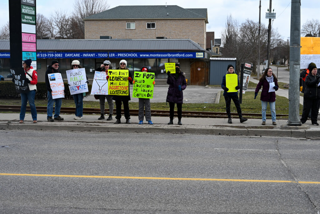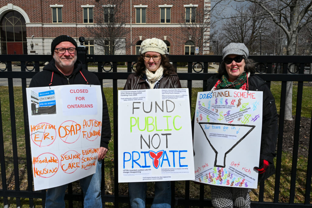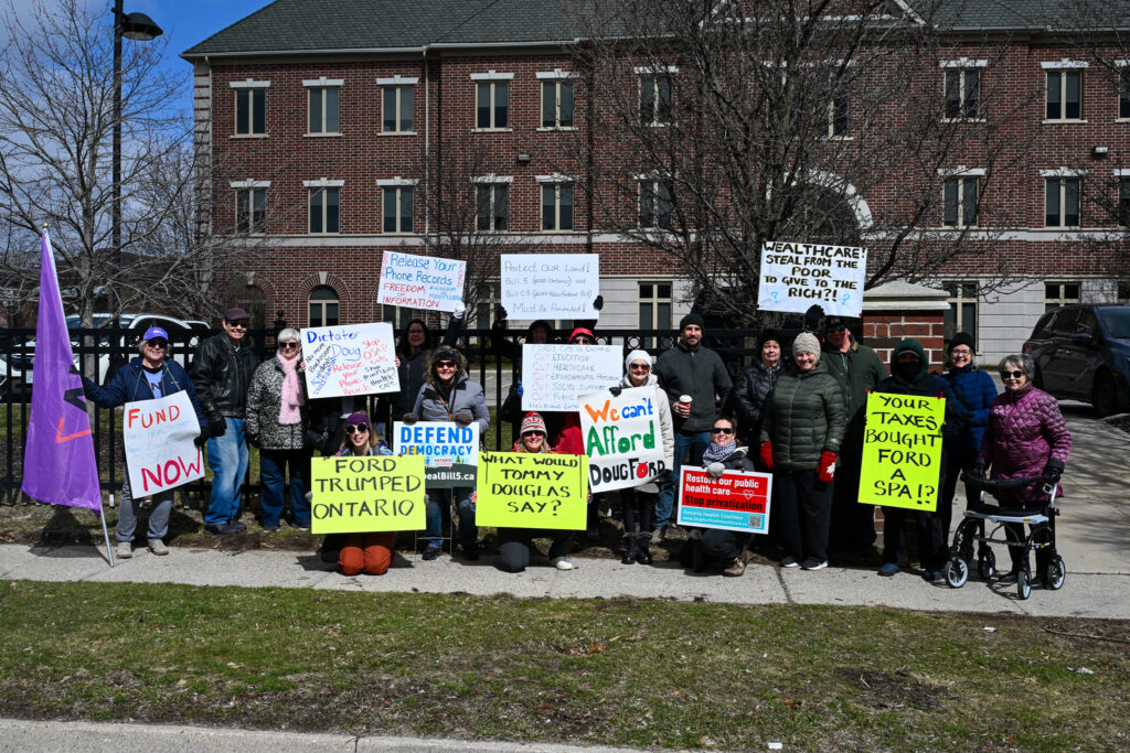 The protest was one of around 30 taking place in municipalities across the province. From Thunder Bay to Ottawa, Timmins, London, Bowmanville, Toronto, Windsor, Niagara, Hamilton and more, hundreds hit the streets to air their grievances and voice their frustrations with Ontario Premier Doug Ford and his conservative government.