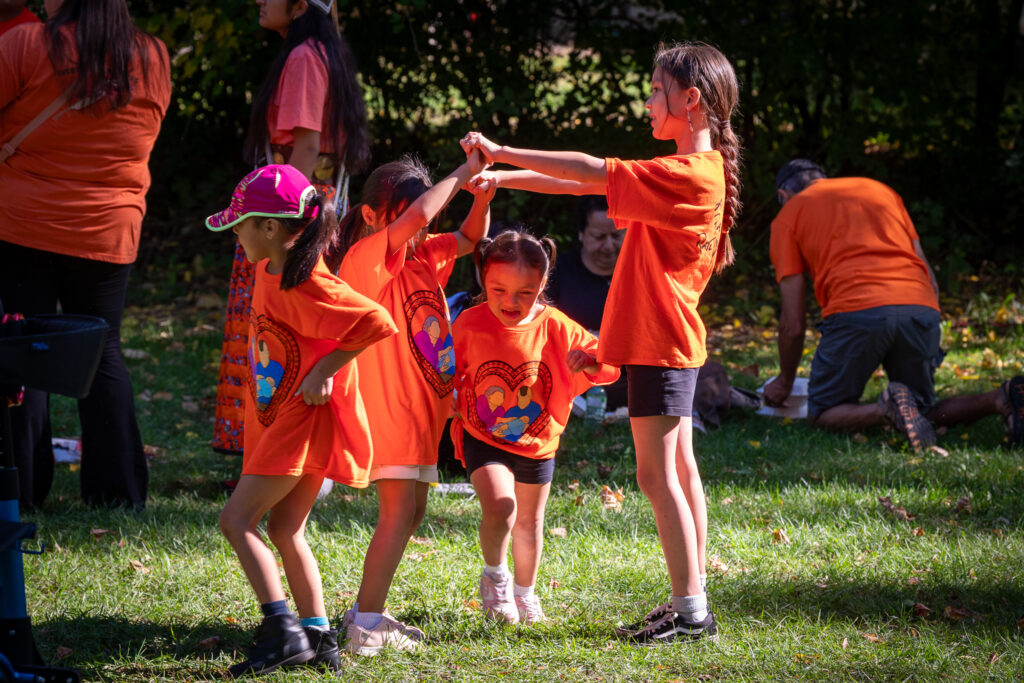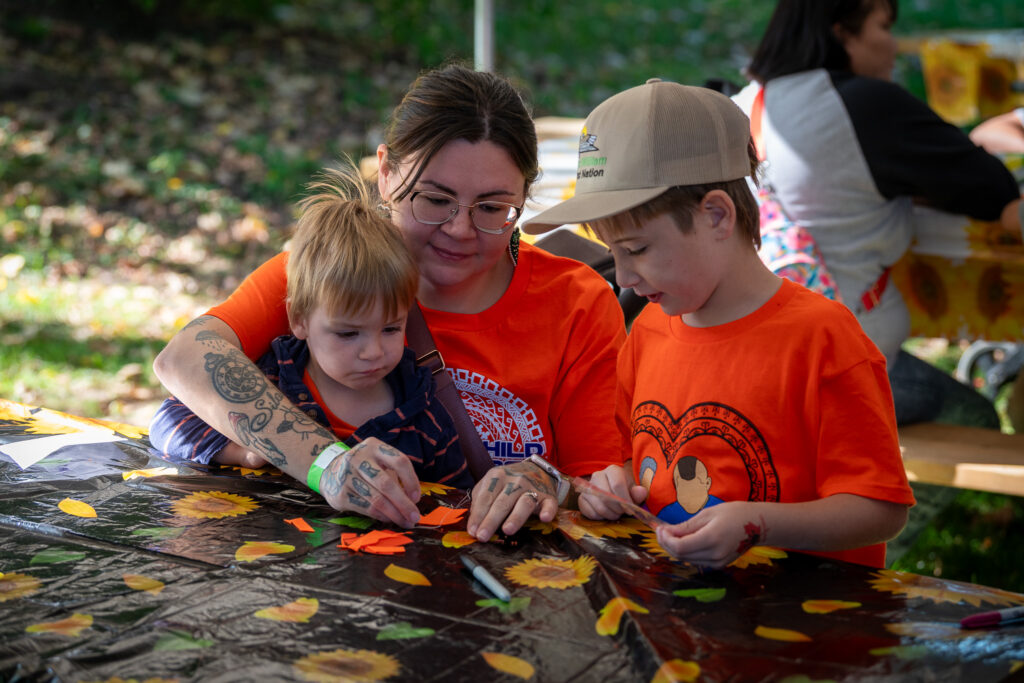 Outside, visitors stopped by to visit with different community partners like the Survivors Secretariat, or the Gihekdagye Friendship Centre (BRISC), grab a bite to eat or a refreshing drink and take part in a community Orange Shirt mural activity.