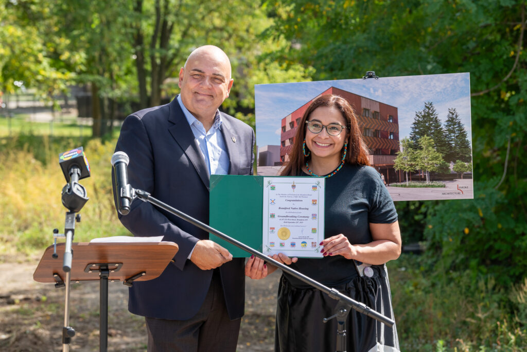 Larry Brock, MP for Brantford-Brant-South-Six Nations, awards Alma Arguello, Executive Director of Brantford Native Housing, with a certificate of recognition during the groundbreaking ceremony for the West Street project on Friday, September 26, 2025.