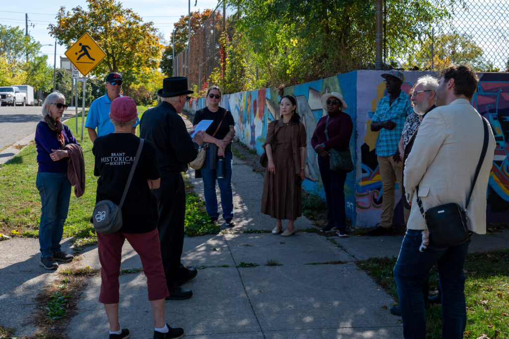 A short while later, Brian Moore, a BHS volunteer, led around a dozen people in a curated heritage walking tour through the east ward, starting at Alexandra Park. The walk featured notable sights and stories of Brantford’s early Black Community.