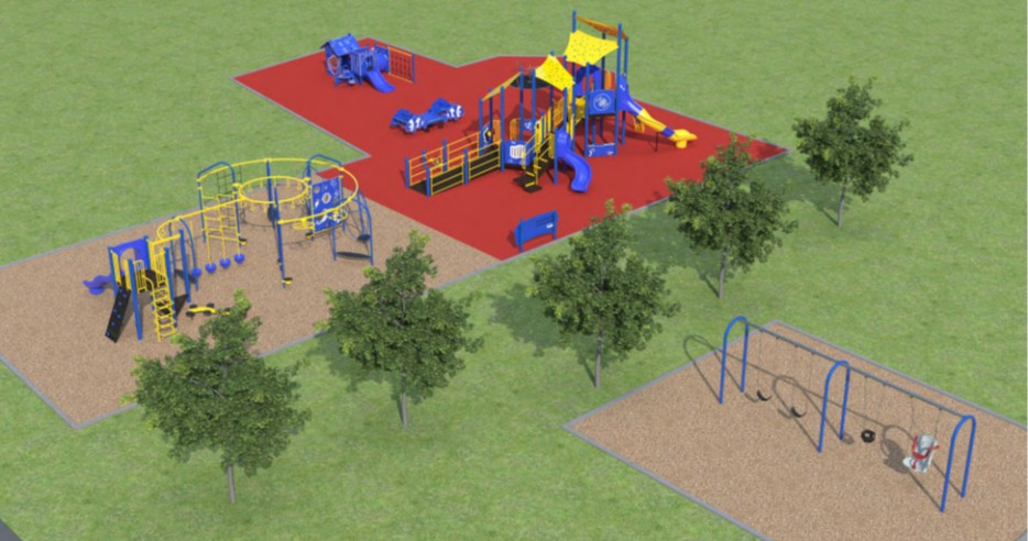 The proposed design includes the installation of accessible playground rubber surfacing and wood chips, a new accessible carousel, and a new play unit that incorporates accessibility features designed for children aged five to 12-years-old. Additionally, there will be a seesaw, and an accessible swing added to the swing set.