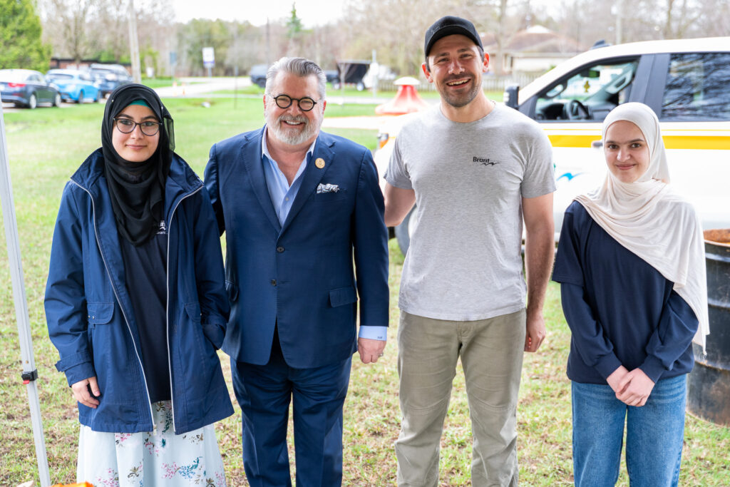County of Brant Mayor David Bailey and Forest Supervisor Trent Meyers pose alongside Paris District High School students, Sundus Nadir (left) and Atifa Khoshhal (right), during the 11th annual County of Brant Community Tree Planting event at Rising Park in Glen Morris on Saturday, April 18, 2026.