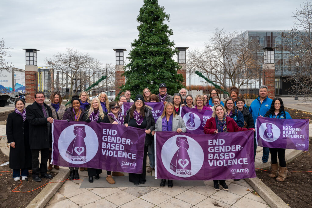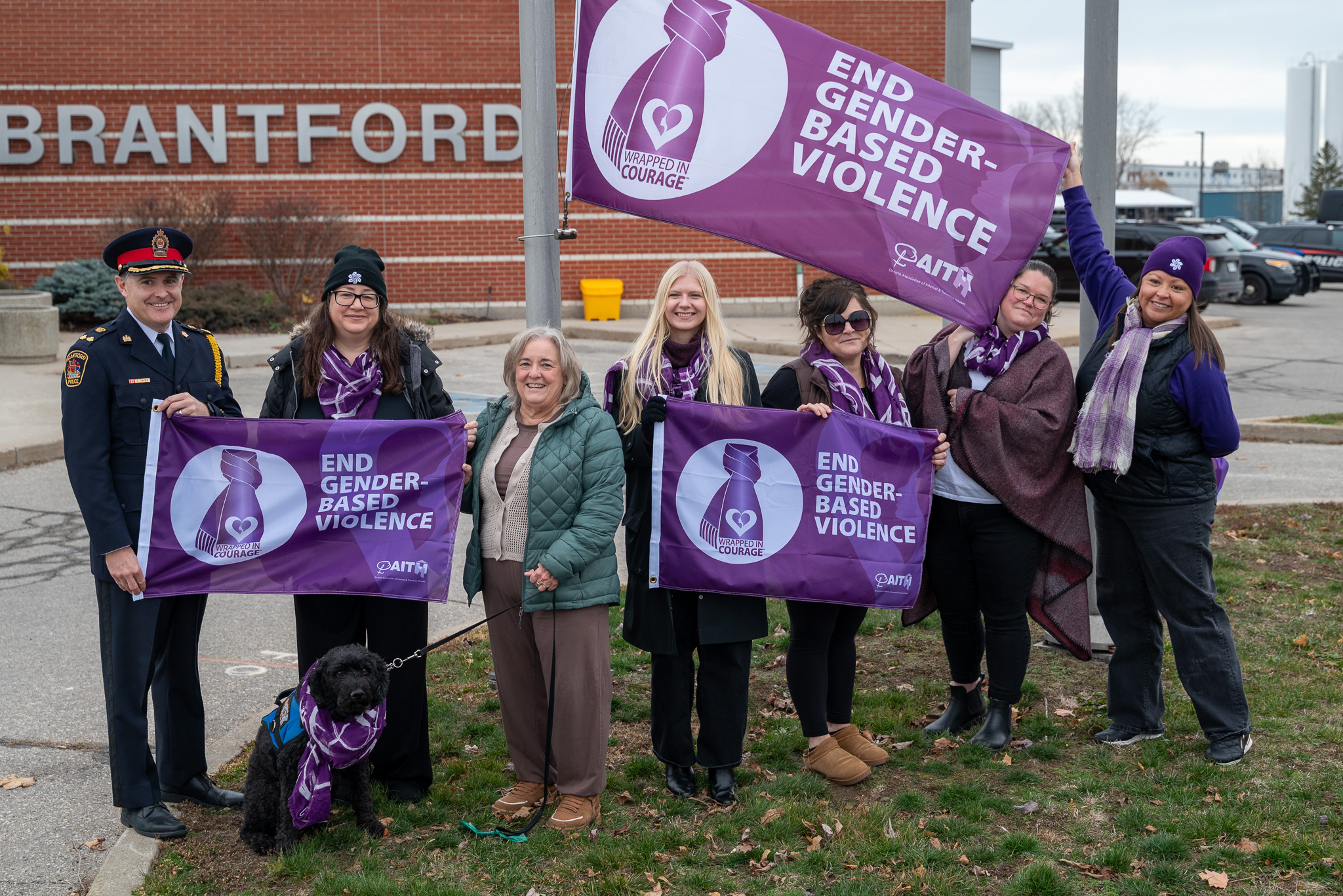 “We are gathering here today to raise the flag for Woman Abuse Prevention Month,” said Natasha Dobler, Executive Director of Nova Vita Brant. “To stand proudly with the Ontario Association of Interval and Transition Houses (OWAITH) and their Wrapped in Courage campaign, to mark the International Day for Elimination of Violence Against Women, and to kick off the 16 Days of Activism Against Gender-Based Violence. This flag is a symbol of courage, solidarity and hope.”